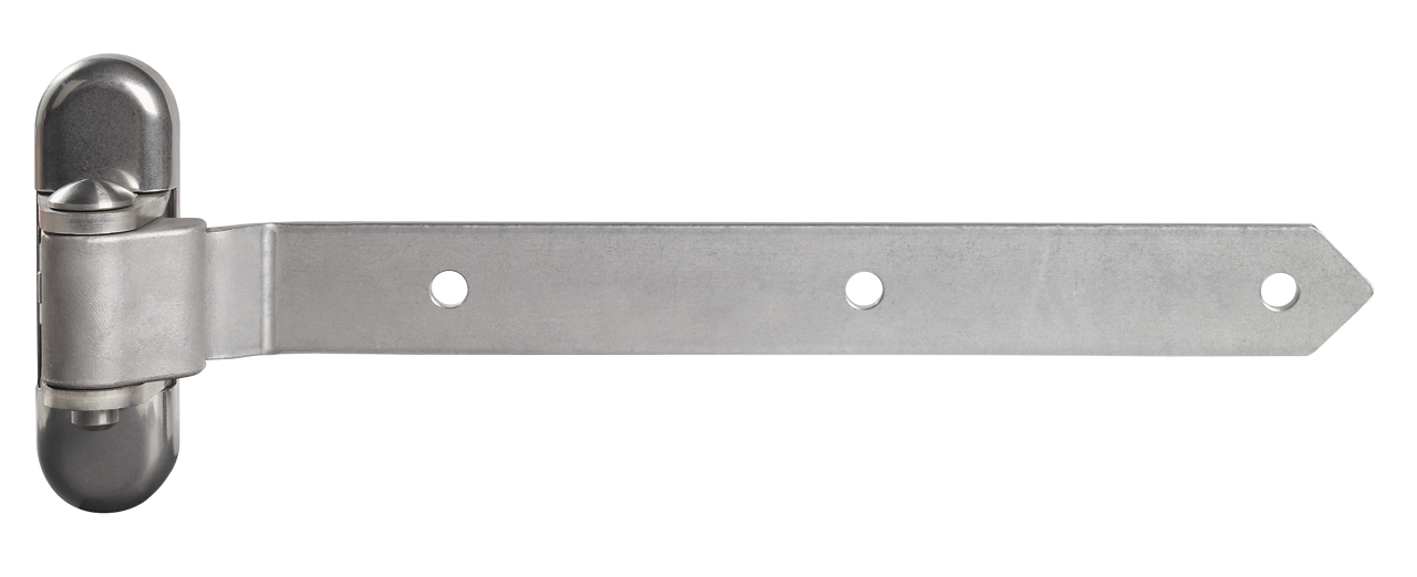Stainless steel strap hinge for wooden gates. The hinge is adjustable in three dimensions; height, left/right alignment and swing direction. This hinge is available with a stainless steel or hot-dip galvanized arm in two sizes.