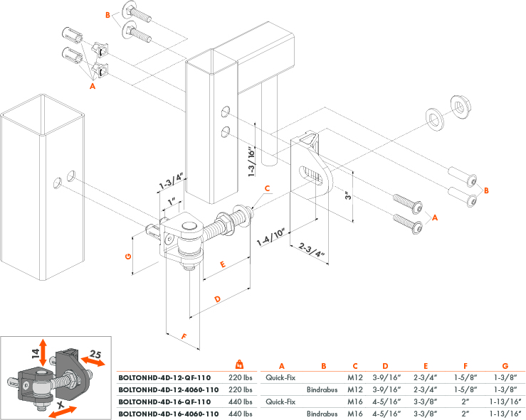 180° Bolt-on 4D adjustable hinge - BOLTONHD-4D-QF-M16-110-02-ALUM