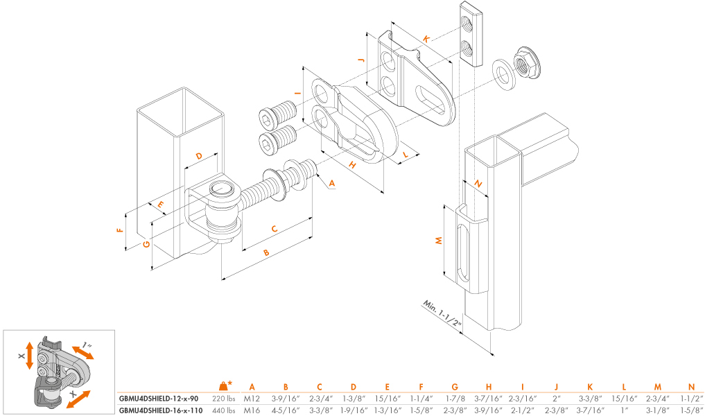 Vandal-proof hot dip galvanized 180° hinge. This secured version of the GBMU4D16 hinge provides extra security since the eyebolt or cross bolt can not be tampered with. With the 4-way adjustability you no longer have to keep left or right turning gates in stock. Height, depth, left and right alignment and turning direction are individually adjustable.