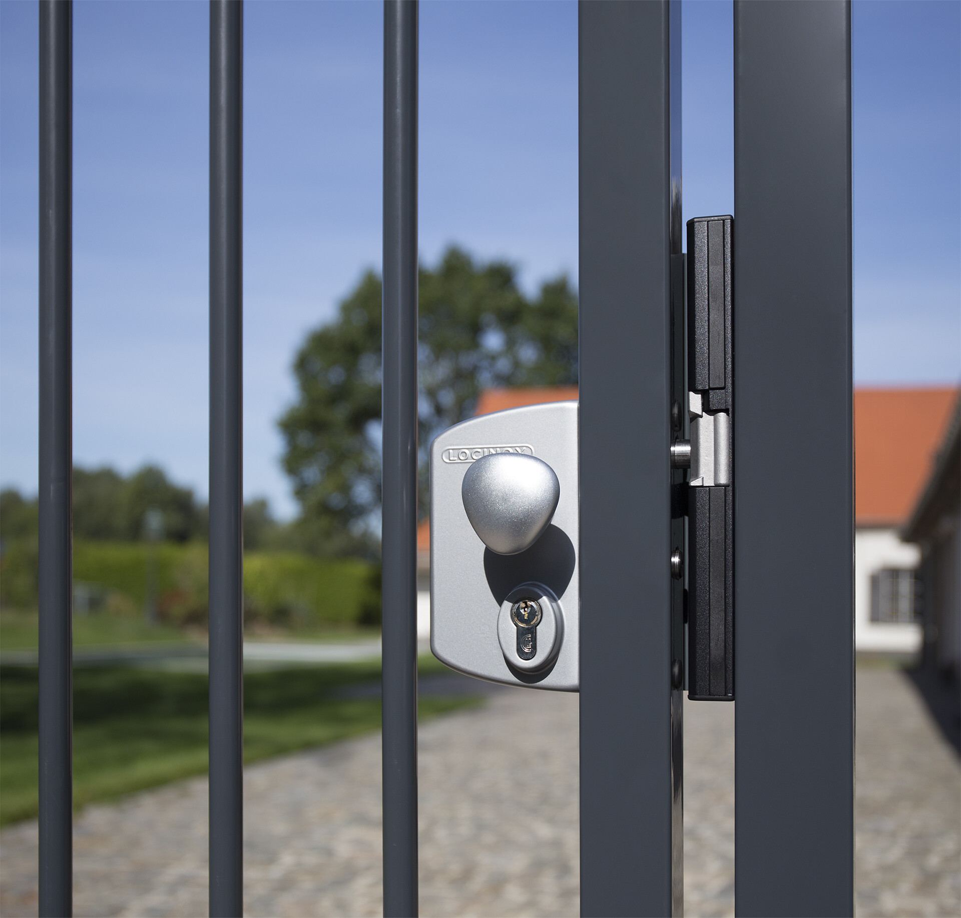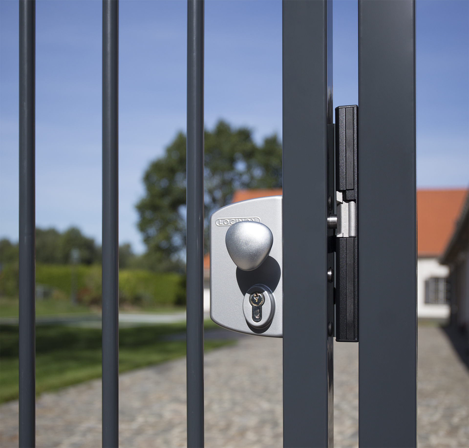 Installed on gate by brick wall