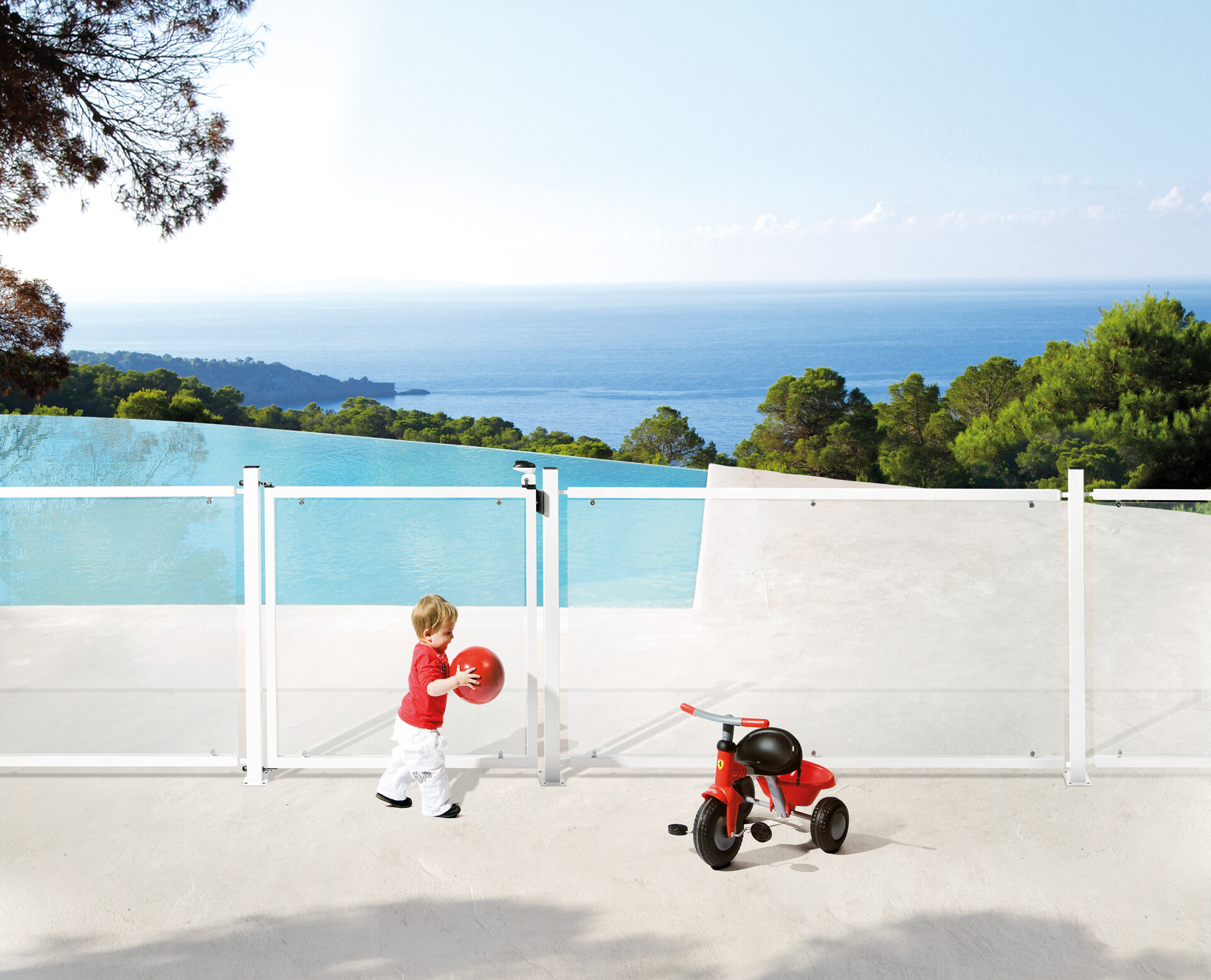 Child with red ball at white swimming pool fence