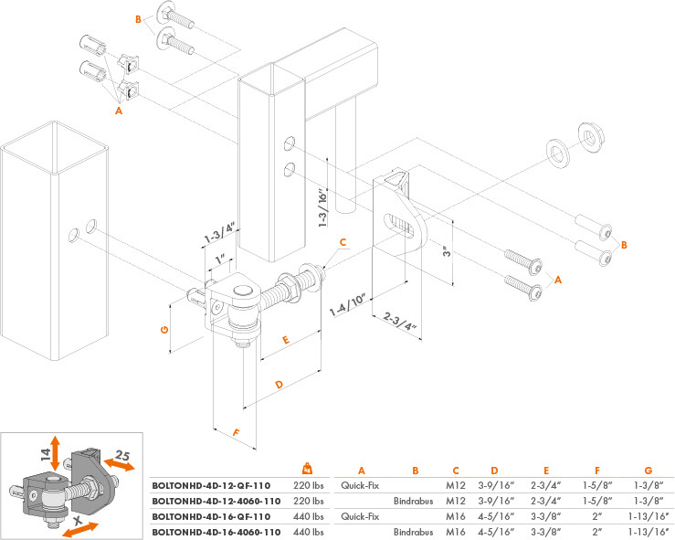 180° Bolt-on 4D adjustable hinge - BOLTONHD-4D-QF-M16-110-50-ALUM