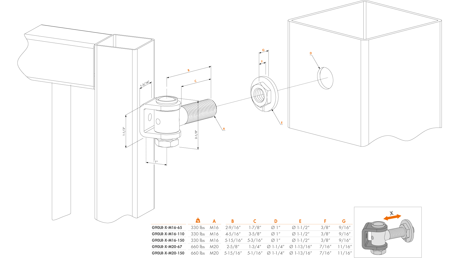 Vandal-proof hot-dip galvanized 90° hinge. This hinge is the perfect solution for all your small industrial gates. The eyebolt can not be tampered with when the gate is closed. With the LR welding nut you can easily adjust the hinge.