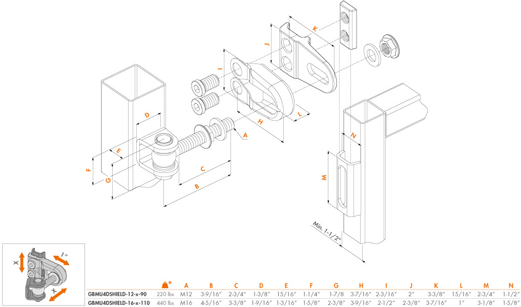 Vandal-proof hot dip galvanized 180° hinge. This secured version of the GBMU4D16 hinge provides extra security since the eyebolt or cross bolt can not be tampered with. With the 4-way adjustability you no longer have to keep left or right turning gates in stock. Height, depth, left and right alignment and turning direction are individually adjustable.