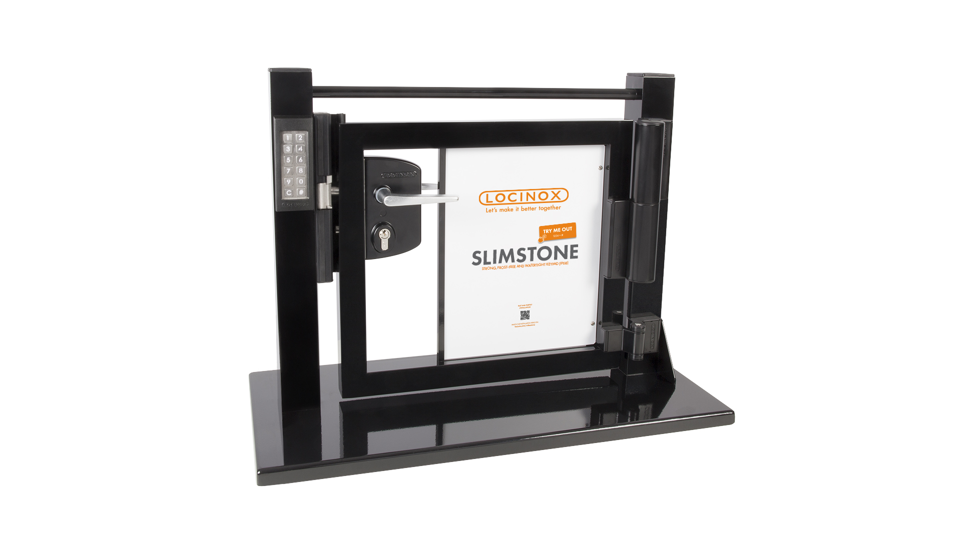 Access control gate display with SlimStone keypad (IP 68), Modulec electric strike and the hydraulic Tiger gate closer.