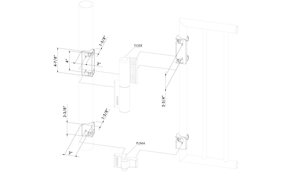 High quality aluminum bracket for installation of Tiger gate closer on round chain link fences. The brackets are installed between gate closer and post. A perfect, firm and easy installation is guaranteed thanks to the drilling jig. The brackets for the Puma hinge are included.