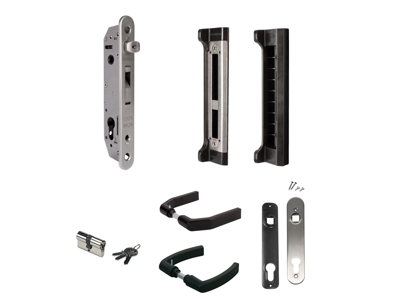 Complete set to equip your metal, PVC or aluminium gates with a 10 mm adjustable, stainless steel insert lock and keep. A safe anchoring of the gate is guaranteed. With handles, stainless steel or polyamide cover shields and 54 mm cylinder.