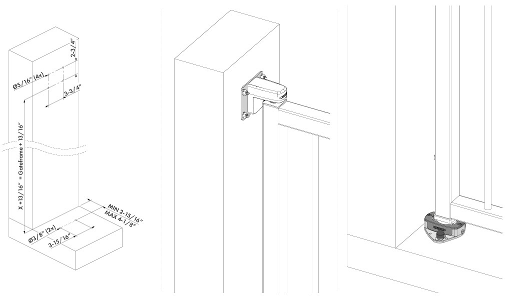 Optional set to fix the Interio gate closer directly on the ground. This set consists of a ground hinge and a wall panel. Including all fixations.