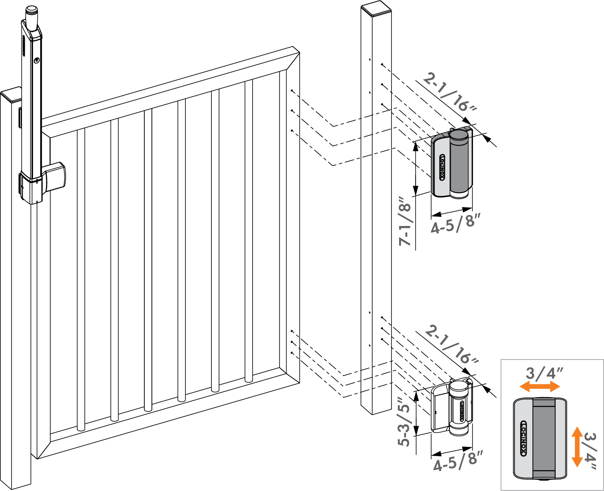 Aesthetic 180° gate closer with adjustable closing speed. The fiberglass reinforced PA housing protects the high-tech internal components, allowing for a perfect functioning in all weather circumstances. Its 13/16" vertical and horizontal adjustability ensures an easy and flexible installation. Firmly fixed with self drilling screws - no welding required. Suitable for installation on square and round frames. Caracal is a perfect fit for swimming pools, playgrounds, parks and garden gates. Including Serval self closing hinge.