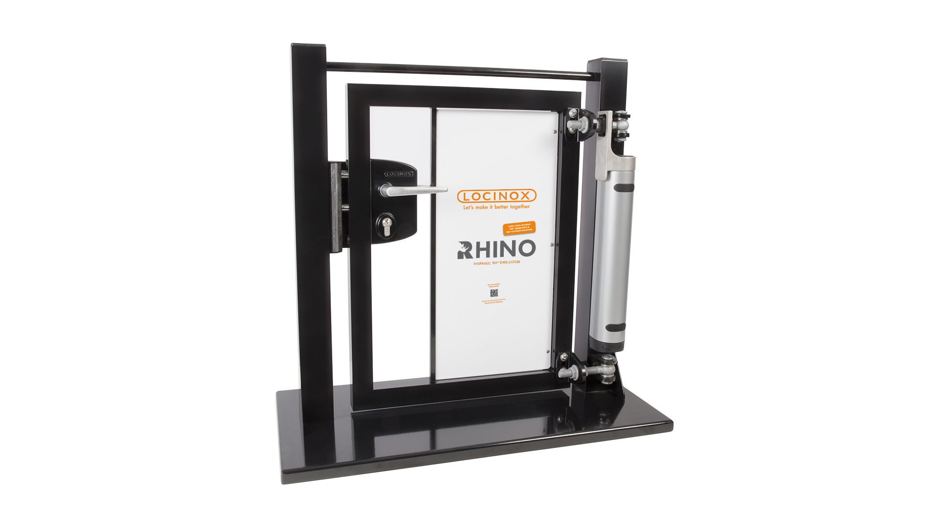 Gate display with Rhino gate closer, industrial lock and BoltonHD-4D hinge