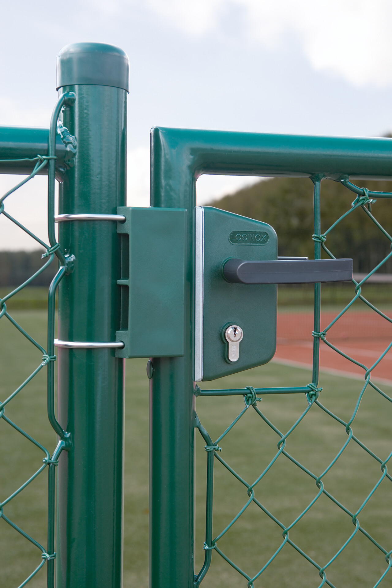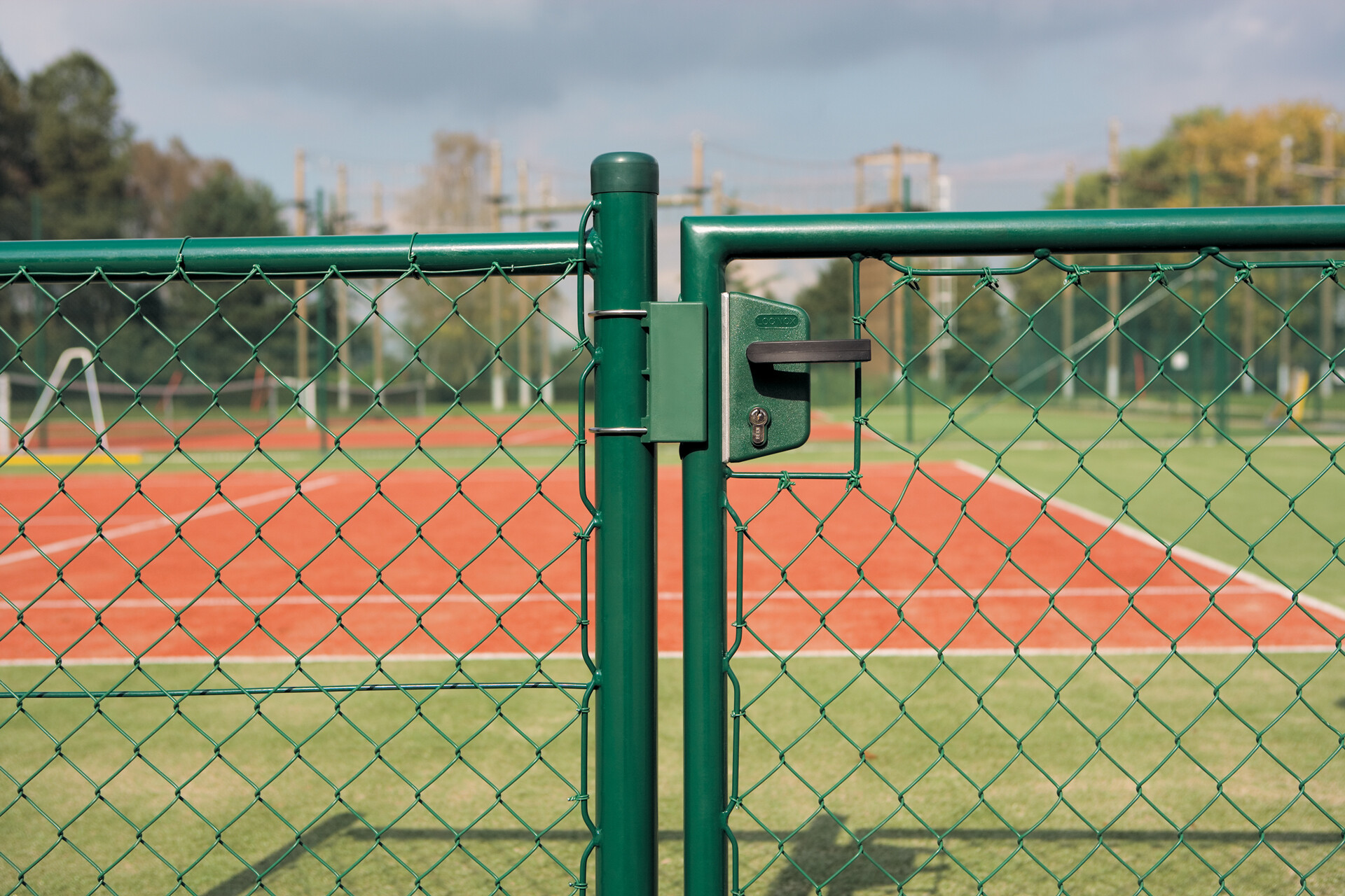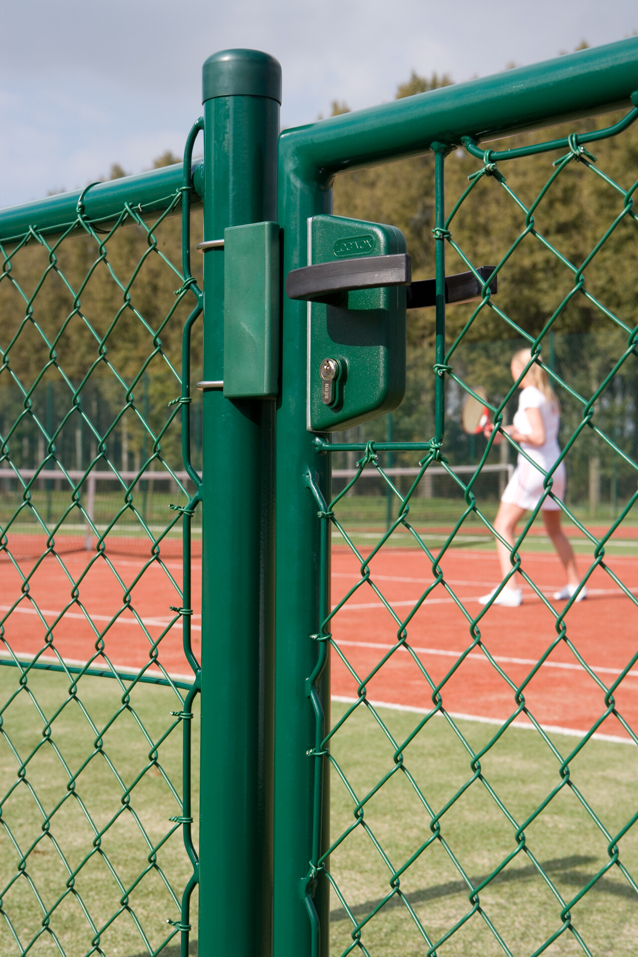 Green gate with tennis player in background