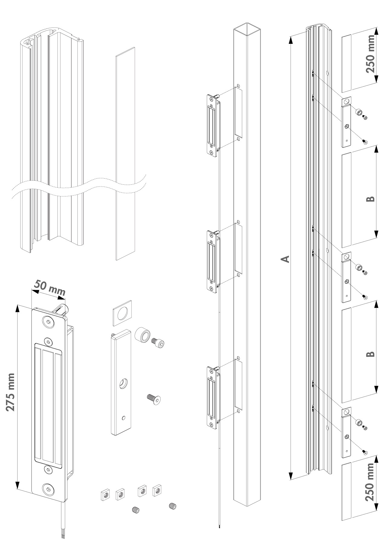 Electromagnetic set for swing gates for fixing to the gate frame. The set consists of two MAGUNIT, the 3006PULL and an aesthetic design profile. Available in SILV and RAL9005.