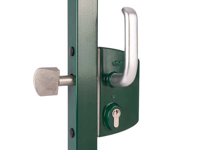 Surface mounted sliding gate lock for Square 1-1/2" profiles with 3006S - Reinforced aluminum handle pair & Cylinder: VSZ - Keyed to differ - Various colors