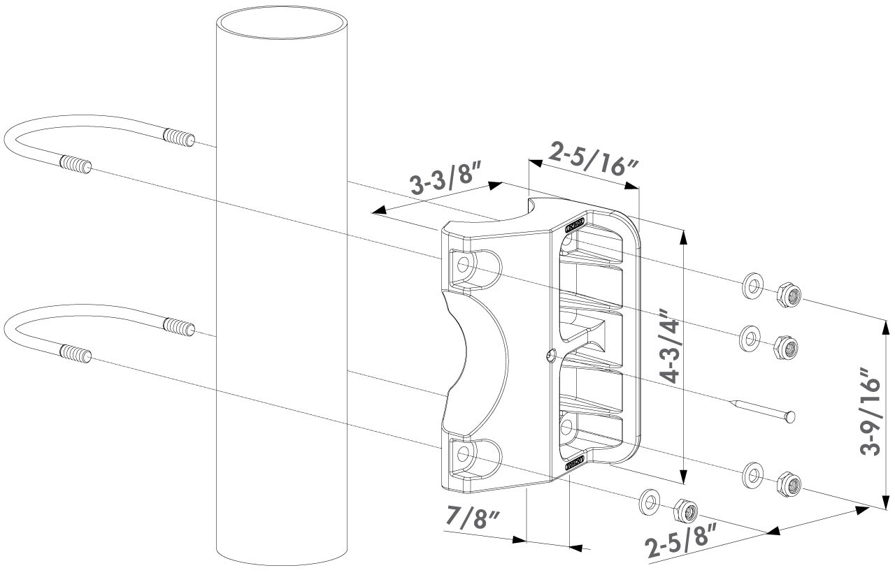Polyamide keep for walk and garden gates. This economical gate stop and receiver is typically used in conjunction with the polyamide bodied garden gate lock LAKZ P1. The U-Bolt mount ensures a fast and strong installation on round tube. This keep is designed for gate profiles 1-1/2" and latch post profiles 2-3/8" round. Latch gap: 7/8"