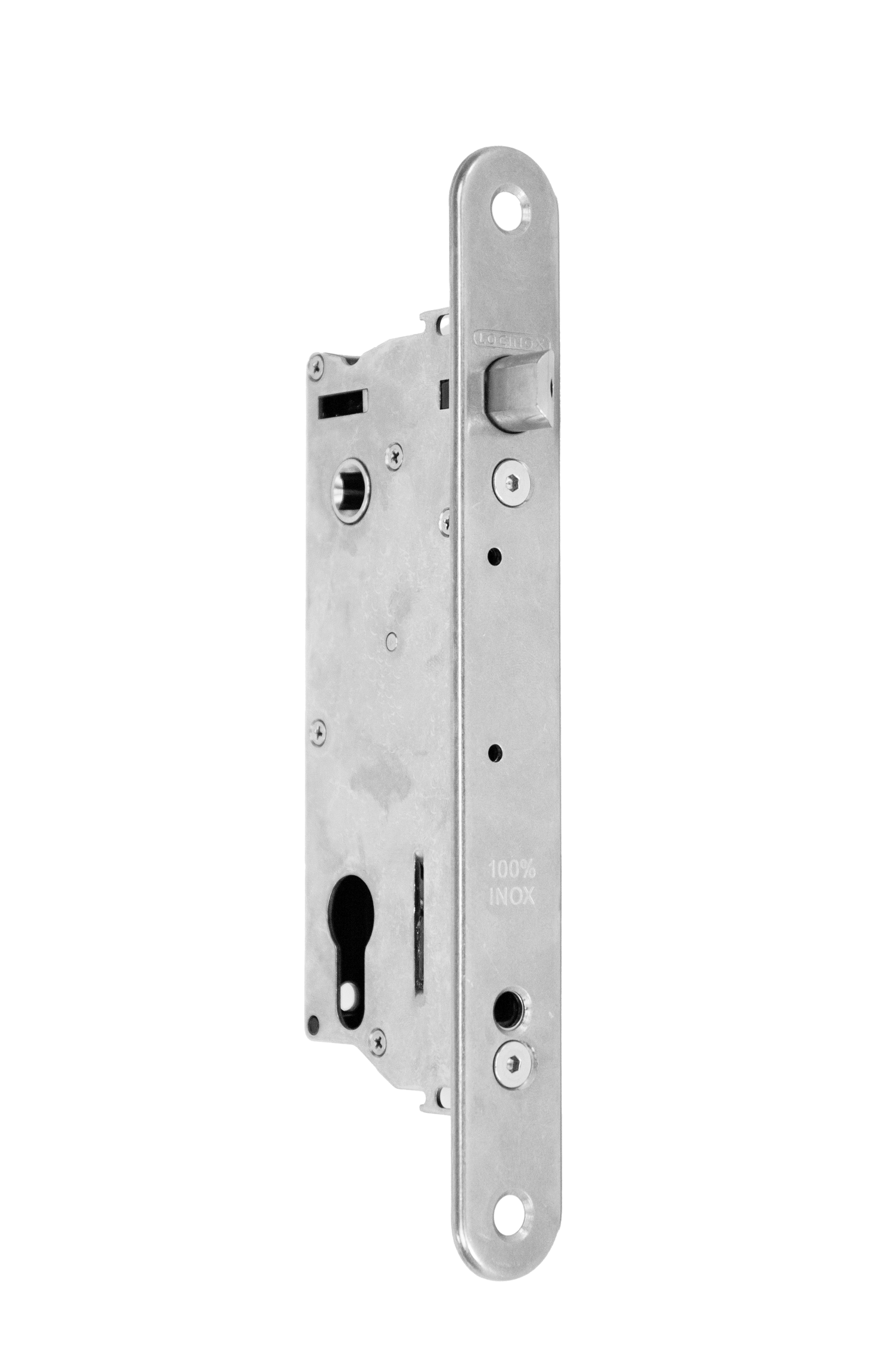 Insert lock recommended for residential applications. It has a 100% stainless steel mechanism, a 1-9/16" backset, and a 3/8" adjustable bolt. A patented internal mechanism provides two locking options through the cylinder on the latch or handles. Both the latch bolt and the handles can be locked when combined with a mechanical keep. To ensure compatibility with electric keeps, there is a setting for an unlocked latch bolt while the handles remain locked. Easy installation using self-drilling screws in a rectangular recess for metal, aluminum, wood, or PVC profiles starting from 2-3/8".