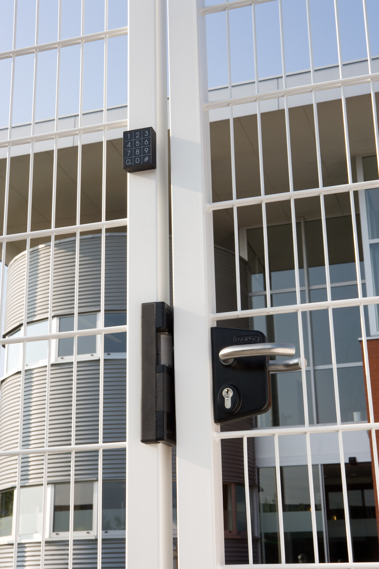 White lock on white gate at company entrance