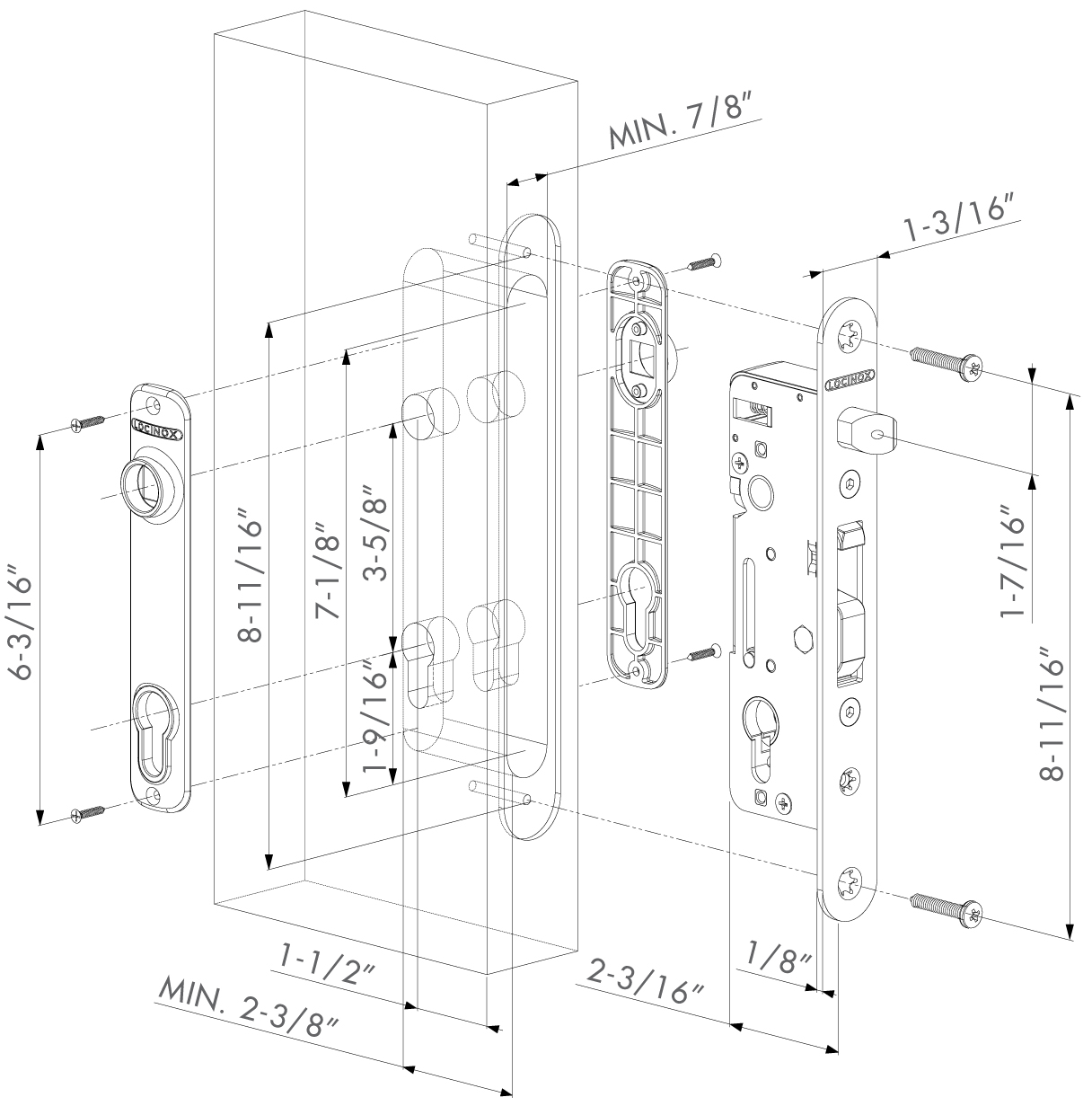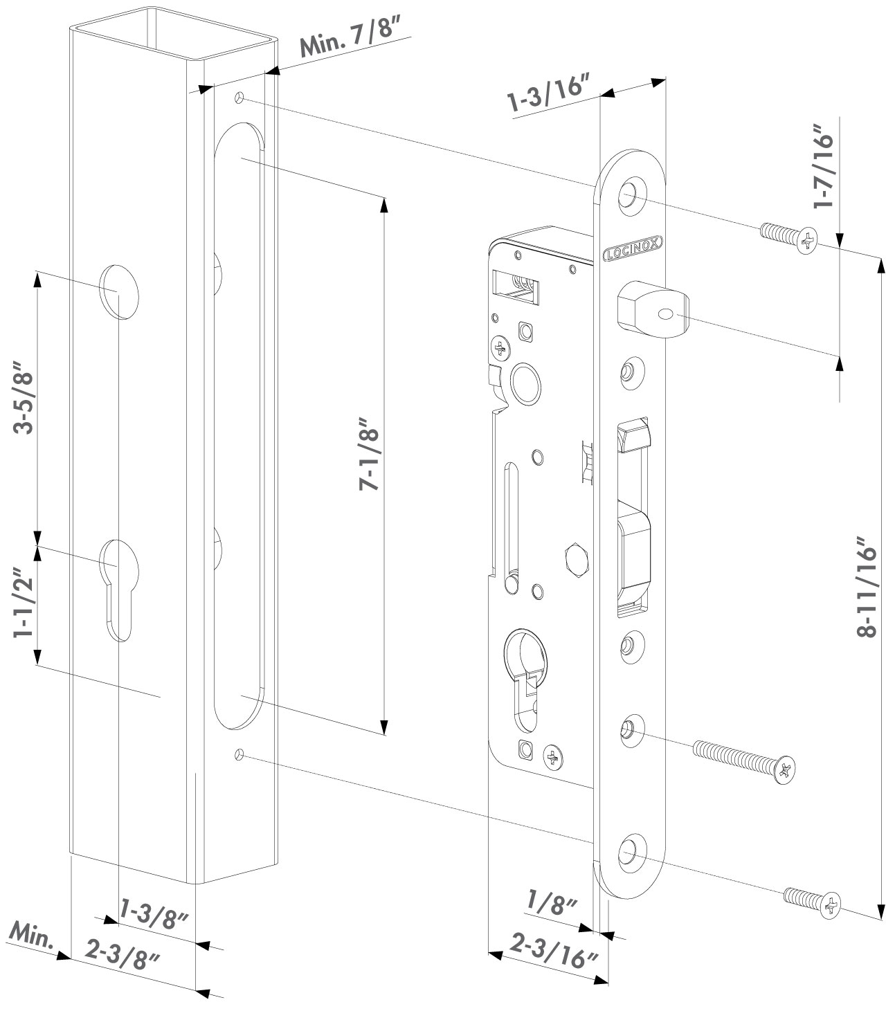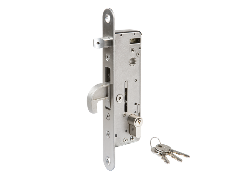 Mortise lock with 100% stainless steel mechanism. This model can be installed on steel, aluminum, or wood gates. The massive stainless steel hook and adjustable latch bolt makes this a one of a kind lock. The combination of the hook (dead bolt) with the SHKM or SHKW keep provides a secure anchoring of your gate while preventing the gate from being pried open as the dead bolt's "hook" locks into the keep's anchoring plate. These locks can be used on metal, wood or aluminum gates or even with our fully prepared profiles. The latch gap required is keep dependent, but the SHKM Hybrid keep requires a 7/8" latch gap.