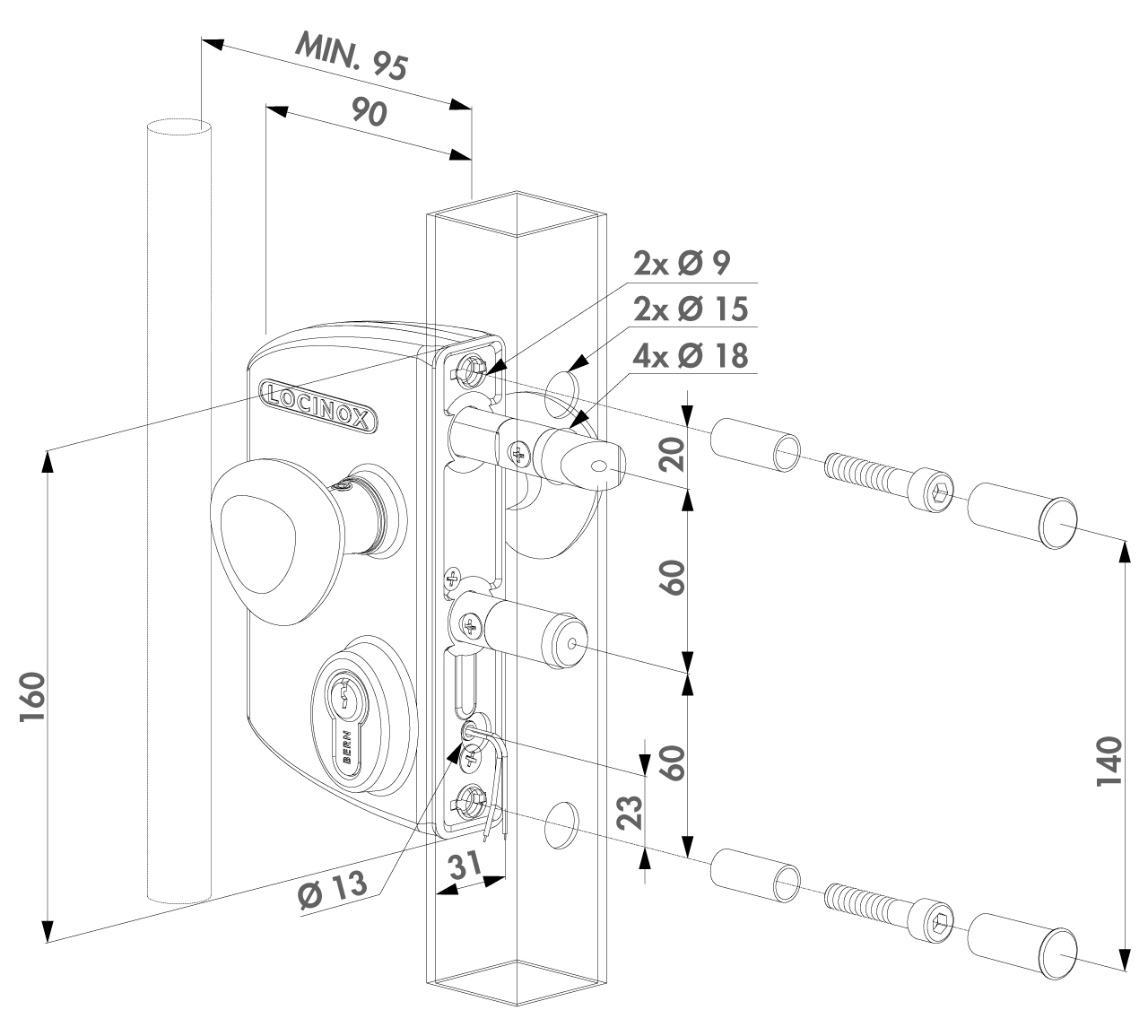 Electric lock with aluminum housing and stainless steel mechanism. The lock functions as a "buzz in - buzz out" device and connects to any 12 Volt control system. The handles are blocked when the lock has no power (Fail Close). The dead bolt is used to override the control system and secure the gate. The latch and dead bolt have 3/4" continuous adjustment to allow perfect latching / locking of the mechanism. A stainless steel throw of 7/8" guarantees secure locking. Ships standard with the round knob handle set. The latch gap required is keep dependent, but the standard and security keeps require a 1-1/4" latch gap.