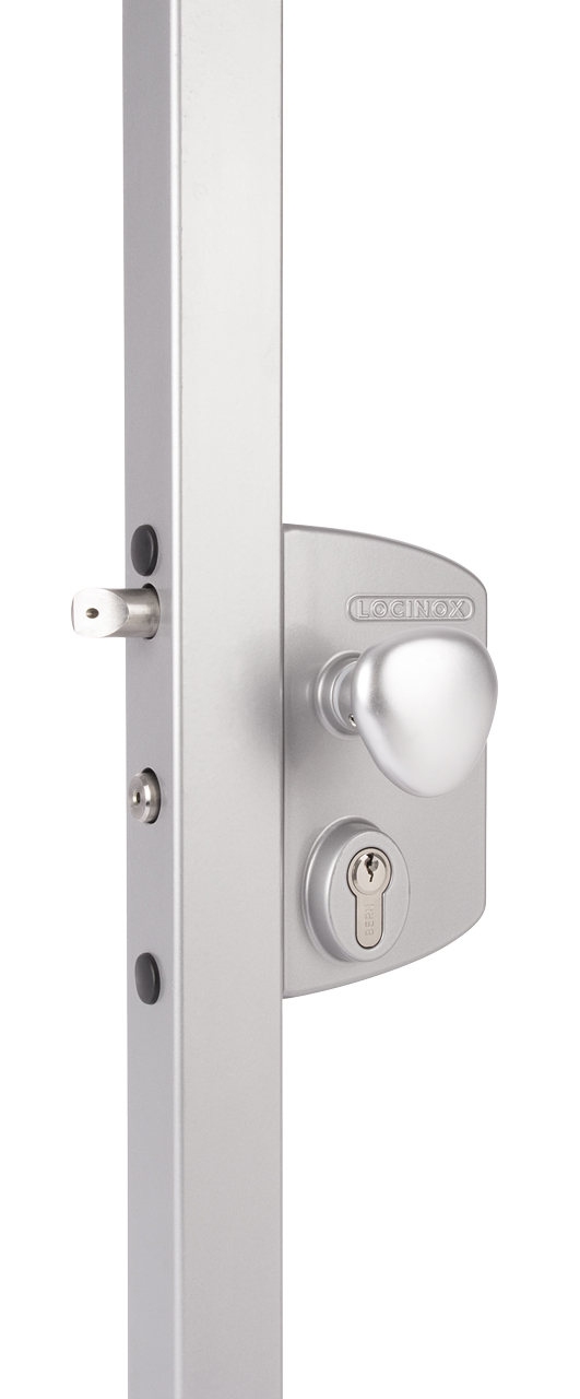 Electrical lock with aluminum housing and stainless steel mechanism. The lock functions as a "buzz in - buzz out" device and connects to any 12 Volt control system. The handles are blocked when the lock is powered. The dead bolt is used to override the control system and secure the gate. The latch and dead bolt have 3/4" continuous adjustment to allow perfect latching / locking of the mechanism. A stainless steel throw of 7/8" guarantees secure locking. Ships standard with the round knob handle set. The latch gap required is keep dependent, but the standard and security keeps require a 1-1/4" latch gap.