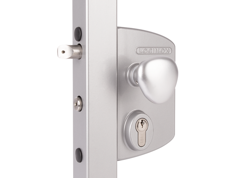 Surface mounted electric gate lock with Fail Open functionality for Square 1-1/4" to 2" profiles with 3006R - Aluminum round knob & Cylinder: VSZ - Keyed to differ - Various colors