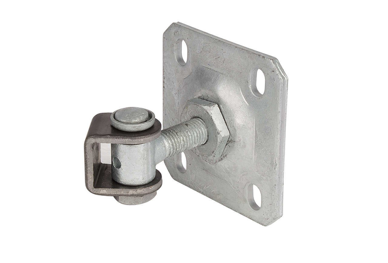 Vandal-proof hot-dip galvanized 90° hinge. This secured hinge is the perfect solution for all your small and medium-sized gates. The eyebolt can not be tampered with when the gate is closed. Thanks to the wall plate with adjustable nut you can easily adjust the hinge.