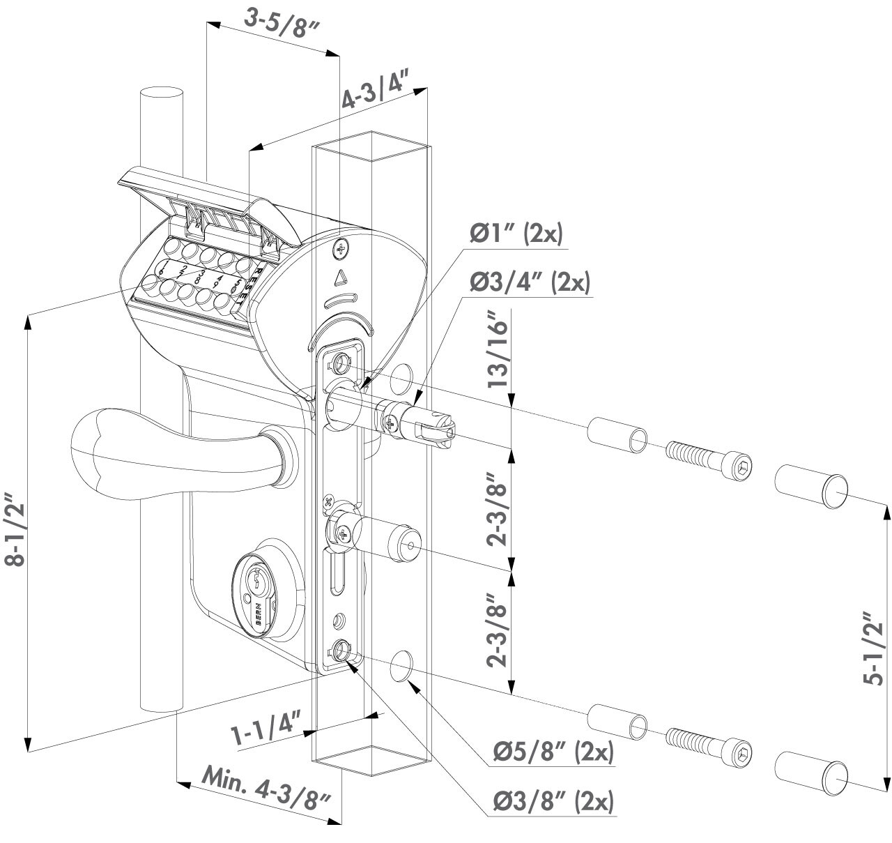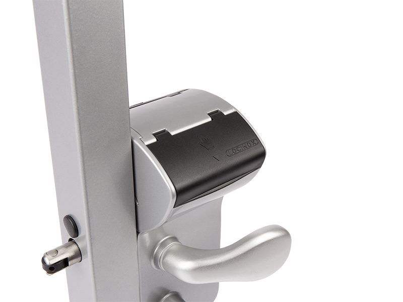 VINCI - Surface mounted mechanical code lock for Square 1-1/4" to 2" profiles in silver, 3006C - Aluminium handle pair & Cylinder: VSZ - Keyed to differ(2 -1/8 in)